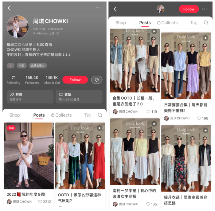 小红书上的一位时尚品牌主理人“周琪CHOWKI”,一条裤子能在她的直播间产生40套搭配方案,满足不同人群在不同场景下的搭配需求。她说自己的核心技能是“一衣多穿”。平日里账号会通过视频方式呈现一衣多穿的不同风格和lifestyle,每周三场直播间更会结合生活场景,分享自己穿搭理念。