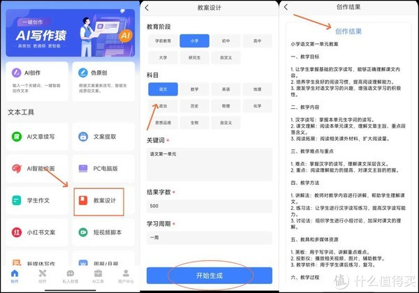 在这款智能AI创作工具中,如果有朋友想要设计教案,只需要选择【教案设计】功能,然后选择教育阶段、科目,填写学科计划、学习周期等关键词,就可以等待结果了。