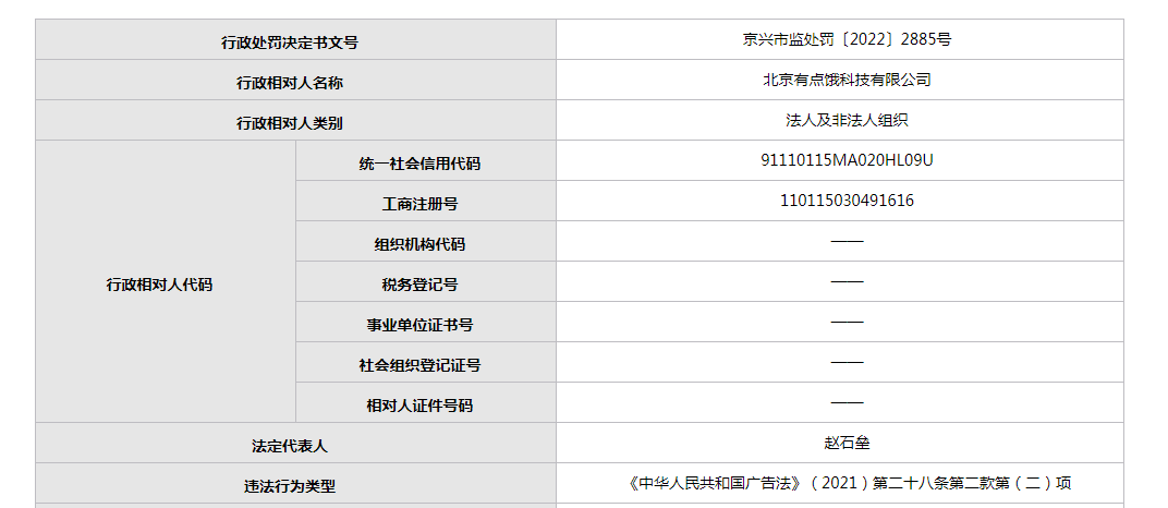 中国质量新闻网讯(闫冬)近日,北京市市场监督管理局网站公布一则行政处罚决定书。北京有点饿科技有限公司因违反《中华人民共和国广告法》被市场监管部门处罚。