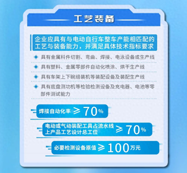 一是从主要生产设备和生产线方面提出相关要求,如切割、焊接、装配等重要的工序流程均需配备与整车产能相匹配的生产线及设备,并满足焊接自动化率达到70%以上、电动或气动装配工具达到流水线上产品工艺设计总工位的70%等关键指标要求;