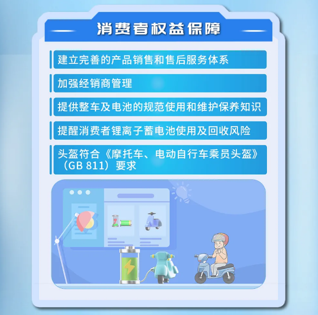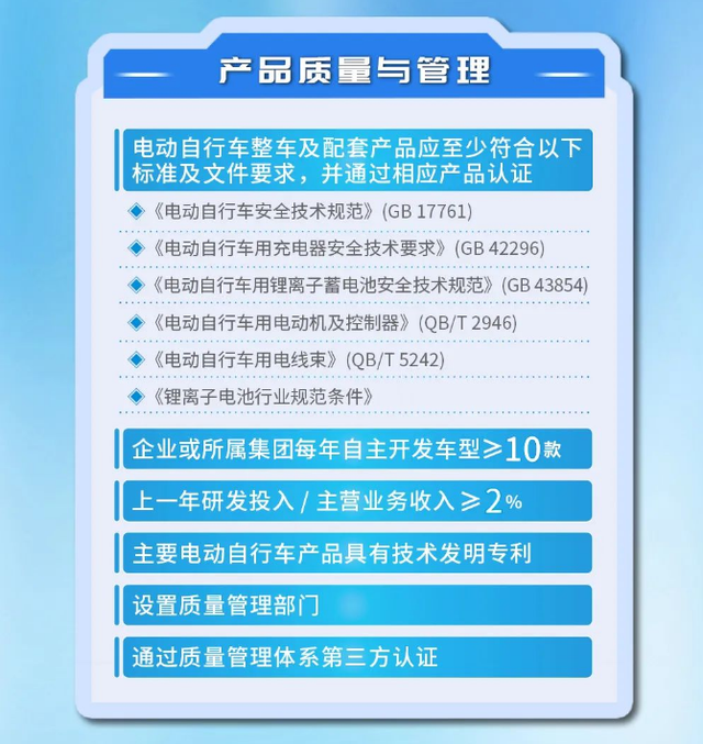 三是强化标准在产品质量保障方面的引领作用,要求电动自行车整车及充电器、锂离子蓄电池、铅蓄电池、电动机、控制器、电线束等关键零部件均应符合相关国家或行业标准;
