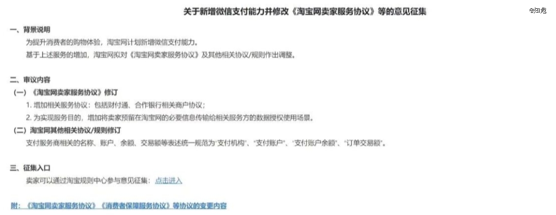 9 月 4 日下午,淘天集团在商家平台发布意见征集,宣布将新增微信支付功能。