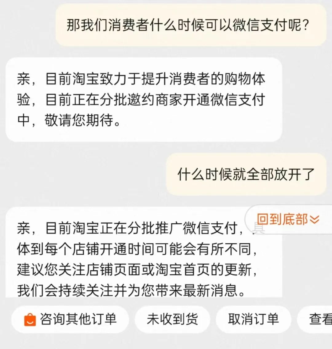 不过,根据新浪科技的报道,淘宝客服回应称,商家分批开通完毕后消费者端将全量上线微信支付。根据节奏,预计全量消费者可以在9月底前使用微信支付。