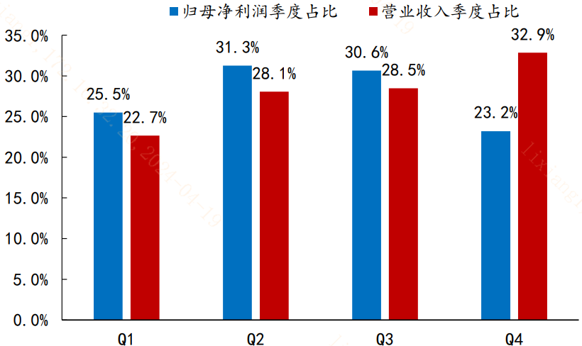 二季度和三季度归母净利润占比高而营收占比中等,是扰动相对较少的业绩数据。