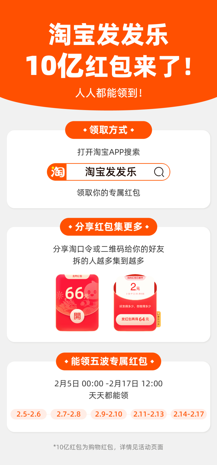 据悉,为了烘托用户春节接好运、阖家欢的氛围,“淘宝10亿红包发发乐”活动将贯穿春节全周期,分开运红包、龙年红包、拜年红包、串门红包、财神红包五波,连发13天。