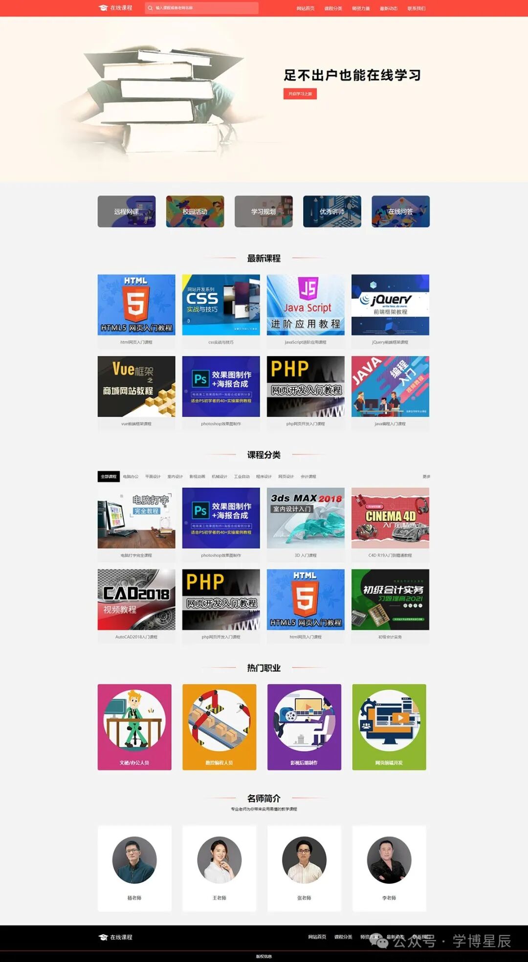 网页模块:头部板块,html导航条制作、html下拉菜单制作、搜索框制作、banner制作、网站首页(一级页面)、课程分类、师资力量、老师课程、最新动态(二级页面)、课程详情页(三级页面)、联系我们(form表单)、底部版权等。