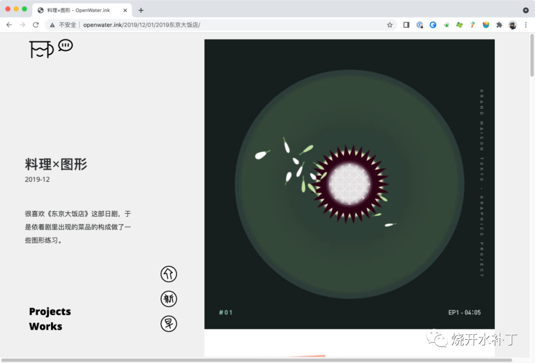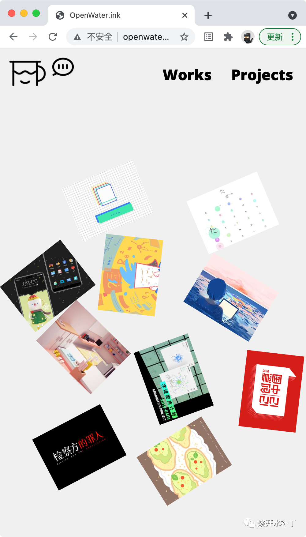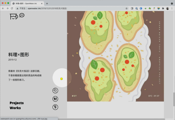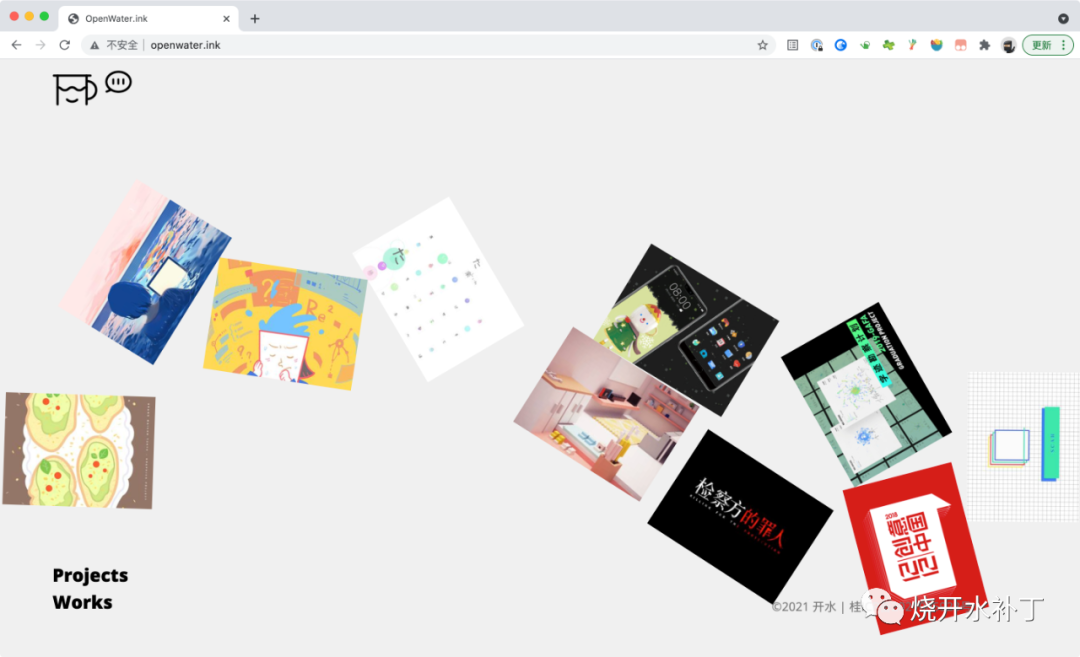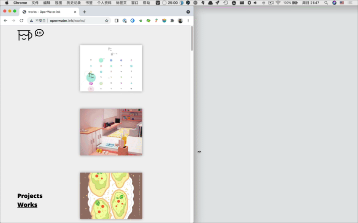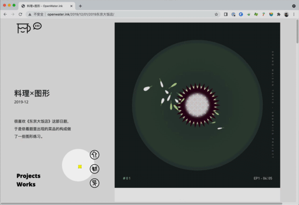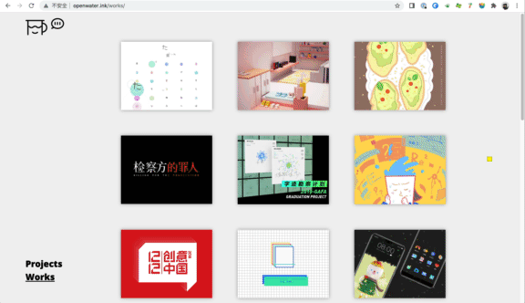 我希望主页“水中方块”上面的空间是尽量开阔纯净的,所以works和projects被安排到了左下角,而画面中除了这两个单词和顶部的图形之外,剩下的都是“水池”的空间,舒爽。