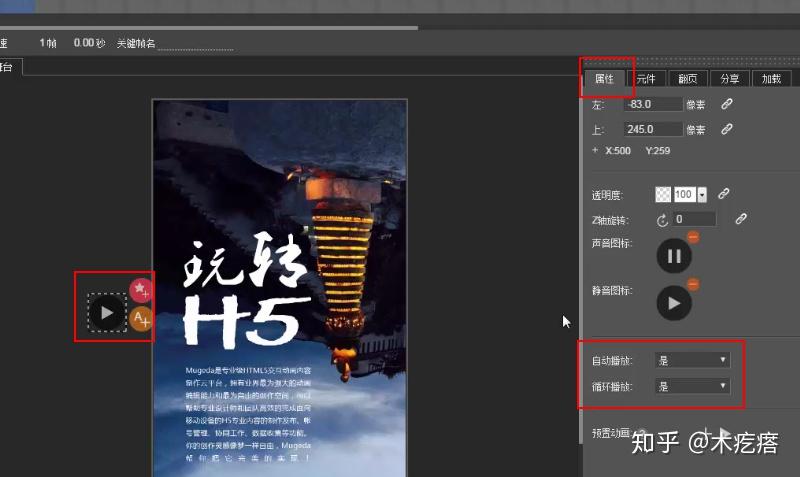 调节背景音乐属性:选中舞台上的背景音乐素材,在其“属性”面板内设置自动播放、循环播放。