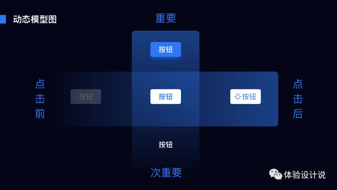 我们都知道各种各样不同名称的按钮,比如行为召唤按钮,灵魂按钮等这些按钮对于大家理解按钮设计很有帮助,但今天不讨论具体的按钮区别,今天主要和大家分享按钮设计的思考决策,通过模型的方式呈现出连接用户、产品的按钮系统设计思考过程。以四张图的形式展现出来,这四张图分别是基础模型图,动态模型图,思考流程模型图,表现形式拆解图(对设计元素进行拆解)