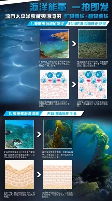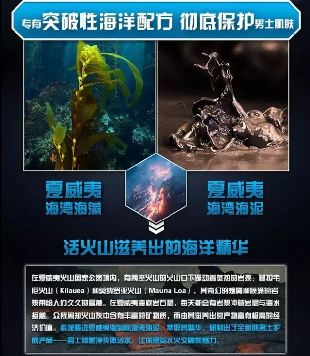 所以这块我们就需要突出夏威夷,火山,海泥,海藻(两个主要成分),然后通过火山这个概念引出主要成分的珍惜牛逼之处(当然,好的图片是必不可少的,所以努力寻找吧)