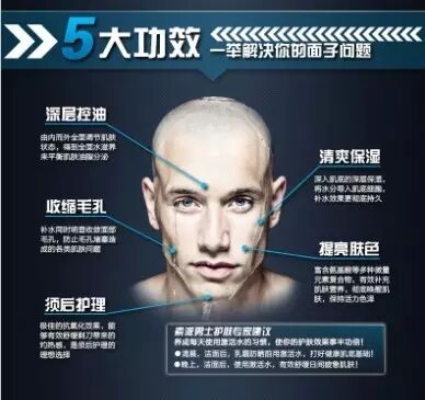 开启男士护肤新一步 ①深层控油 ②清爽保湿 ③提亮肤色 ④收缩毛孔 ⑤须后护理