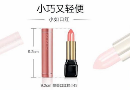 突出“小”可以用尺寸来表示,但是一般人对尺寸没有什么概念,这就需要通过对比物来体现出来。这样的对比物口红和手机是最好的,因为这些物品大家都会随身携带,很容易质感地感觉到南孚充电宝也是非常便携的;另外就是南孚充电宝和口红、手机的尺寸刚好吻合。