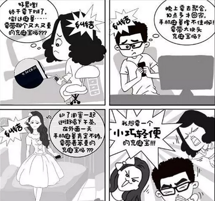 以上漫画塑造了下班路上、要去聚会、逛街这三个场景,通过与大而重的充电宝的对比,突出南孚充电宝的小巧轻便,刺激痛点,把这个痛点放大: