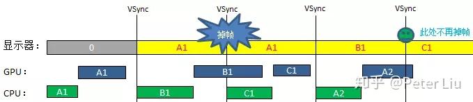 而当一帧画面绘制完成后,电子枪回复到原位,准备画下一帧前,显示器会发出一个垂直同步信号(vertical synchronization),简称 VSync。