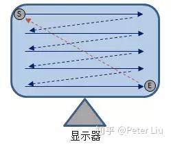 以CRT显示器为例(液晶显示器原理类似),CRT的电子枪从左到右,从上到下进行逐行扫描,扫描完成后显示器就呈现一帧画面,随后电子枪回到初始位置继续下一次扫描。