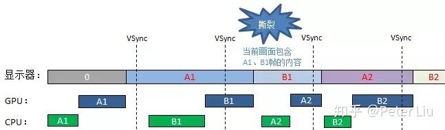 当然,随着系统运行,1/3这个比例会发生变化,1/3,2/3,1,1/3,循环;这种帧与帧之间的不完全覆盖重合现象就是撕裂现象。